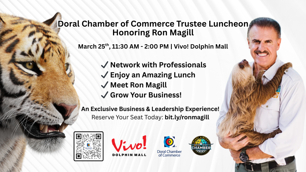 The Doral Chamber of Commerce proudly invites you to a very special Trustee Luncheon honoring the legendary Ron Magill, Communications Director and Zoo Goodwill Ambassador of Zoo Miami.